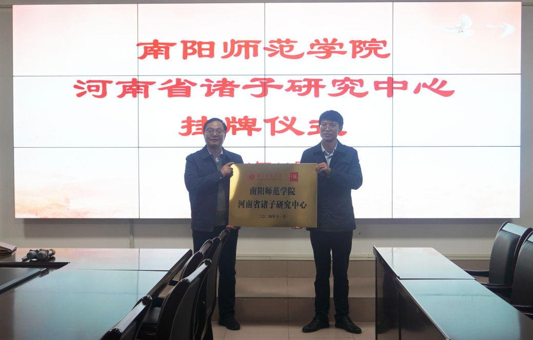 本网讯(胡婉婷、马晓玲/文 杨轹文/图)2024年11月25日下午,必赢71886网址登录举行了“河南省诸子研究中心”挂牌仪式。仪式由文化产业研究院院长马晓玲主持,社科处处长李长亭、文学院院长龚世学、新闻与传播学院副院长张永祥及诸子研究教师代表出席。