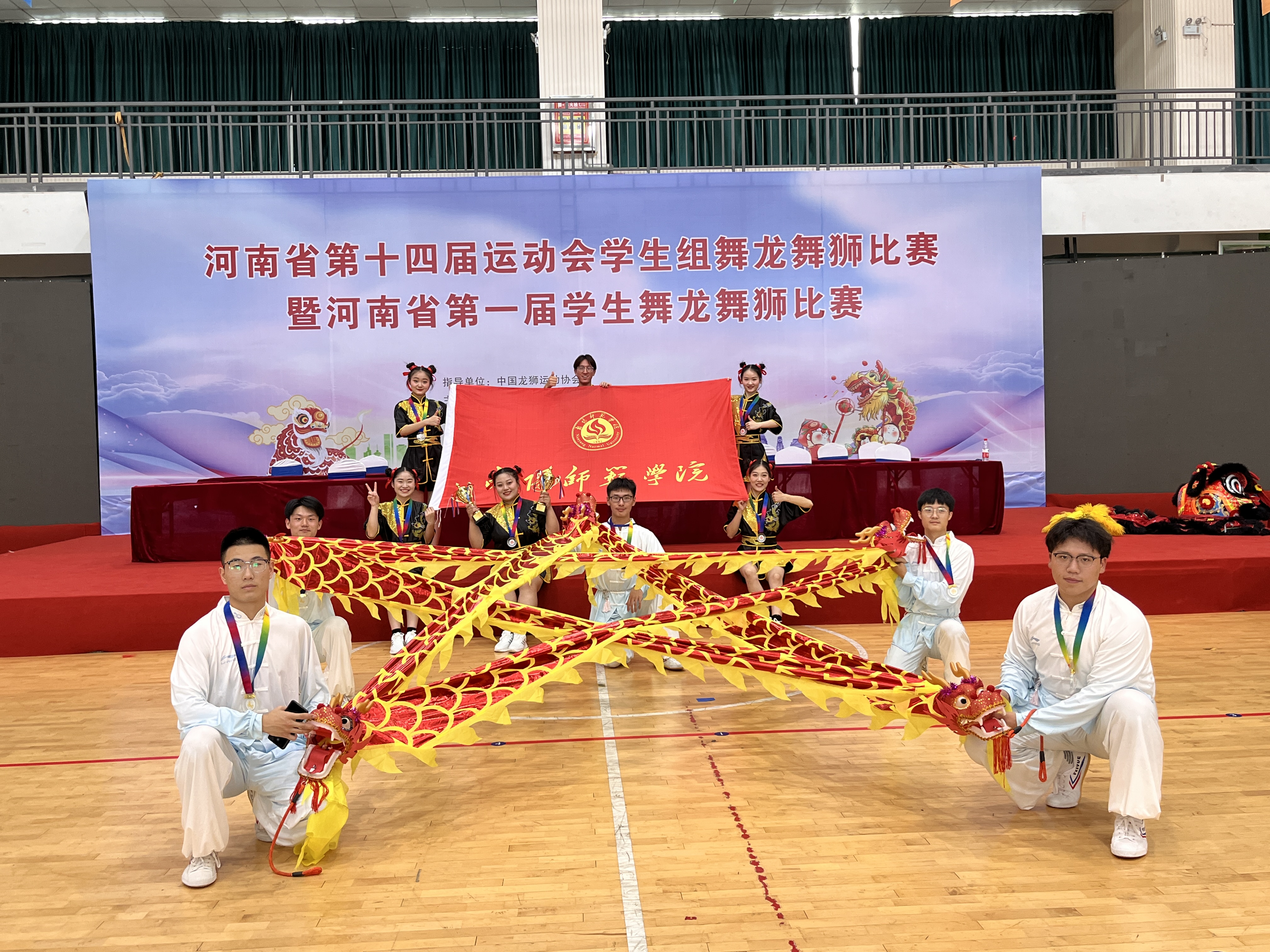 本网讯(鲁丽/文 何静/图)6月8日-11日,河南省第十四届运动会学生组舞龙舞狮比赛暨河南省第一届学生舞龙舞狮比赛在平顶山举行。此次比赛共有来自省内的15所高校近300名运动员参加,分别角逐舞龙、南狮、北狮、健身龙舞4个大项15个小项。必赢71886网址登录代表队派出11位参赛队员,获得健身龙舞《崛起中国龙》规定套路比赛第一名和《舞出我中华》规定套路比赛第三名的好成绩。这是必赢官网首次参加此类项目并获奖,实现了龙狮项目零突破。