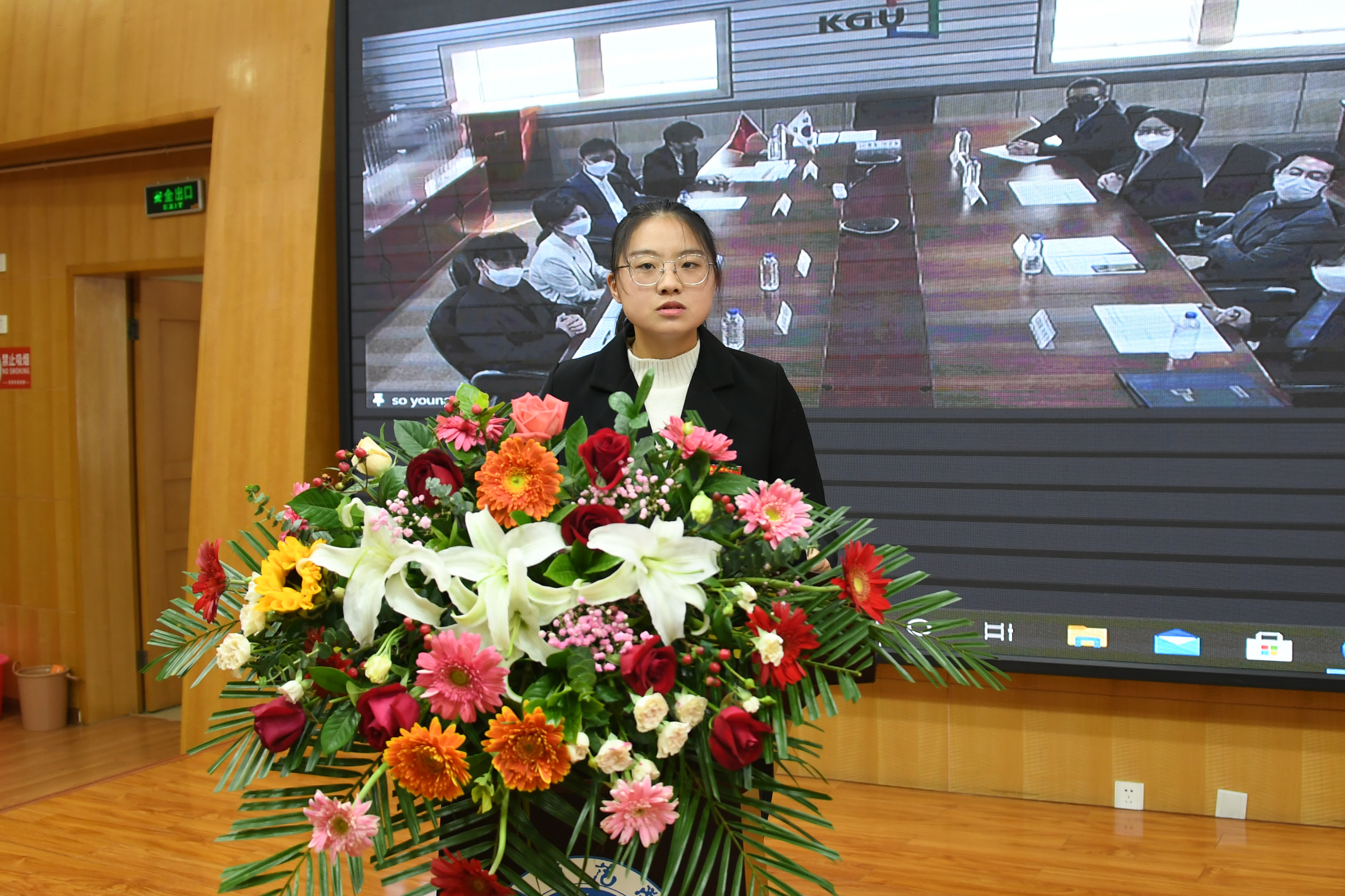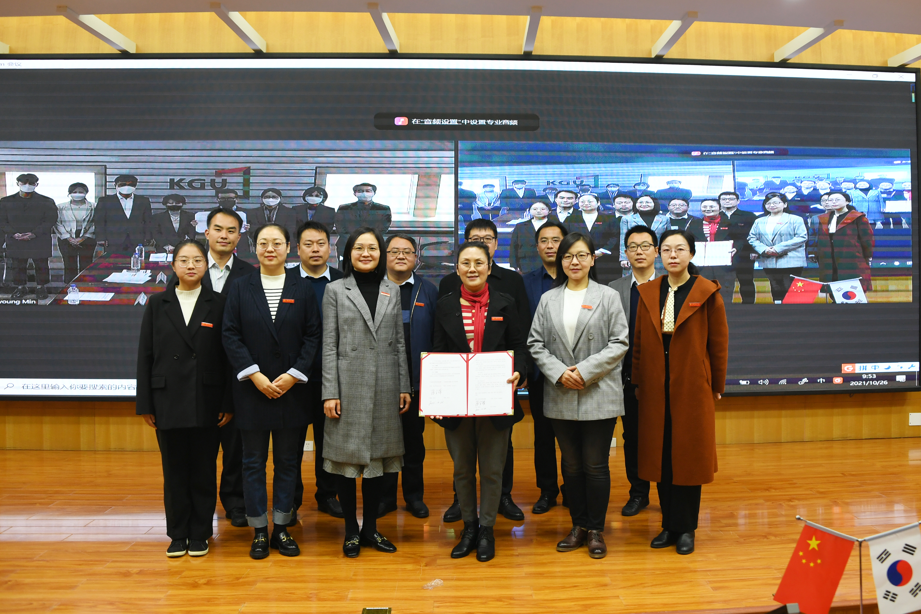 本网讯(通讯员 李磊/文 王赛赛/图)10月26日上午,必赢官网在科技大楼三楼会议室通过视频会议形式召开必赢71886网址登录与韩国京畿大学合作设立中外合作办学机构签约仪式暨中外合作项目新生开学典礼。校长张宝锋、副校长刘红林出席典礼。京畿大学校长全準喆、国际交流处、艺术体育学院负责人和相关工作人员列席会议。必赢官网教务处、学生工作处、国际交流合作处、物理与电子工程学院、机电工程学院主要负责同志以及2021级机械电子工程专业中外合作办学项目学生代表参加会议。开学典礼由副校长刘红林主持。