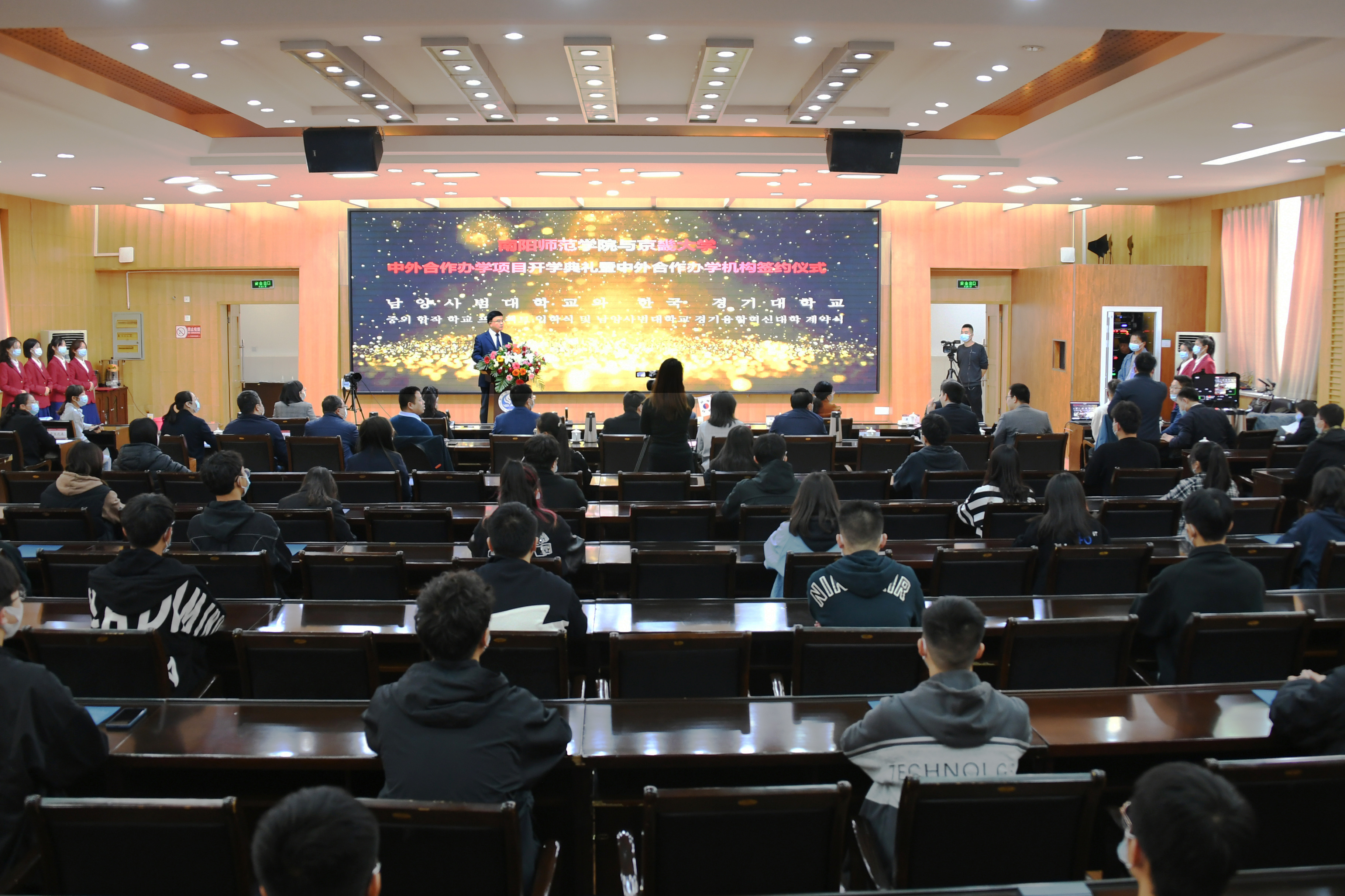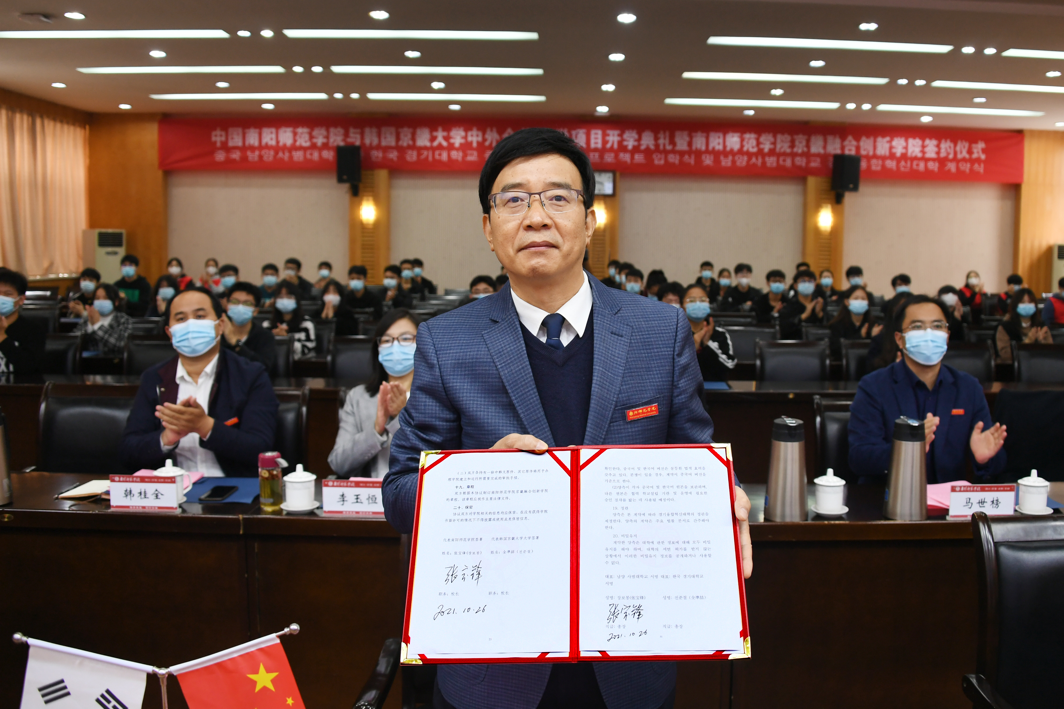 典礼上,张宝锋和全準喆分别代表两校签署了《中国必赢71886网址登录与韩国京畿大学合作设立必赢71886网址登录京畿融合创新学院协议》。