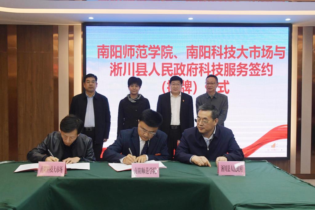 周旗对“南阳师院淅川科技创新服务中心”的服务内容和运行模式进行了解读,刘红林、丁卓、崔改平代表三方签署“校地合作科技服务框架协议”,卢志文、周旗、张梅、王兴勇为“南阳师院淅川科技创新服务中心”揭牌。