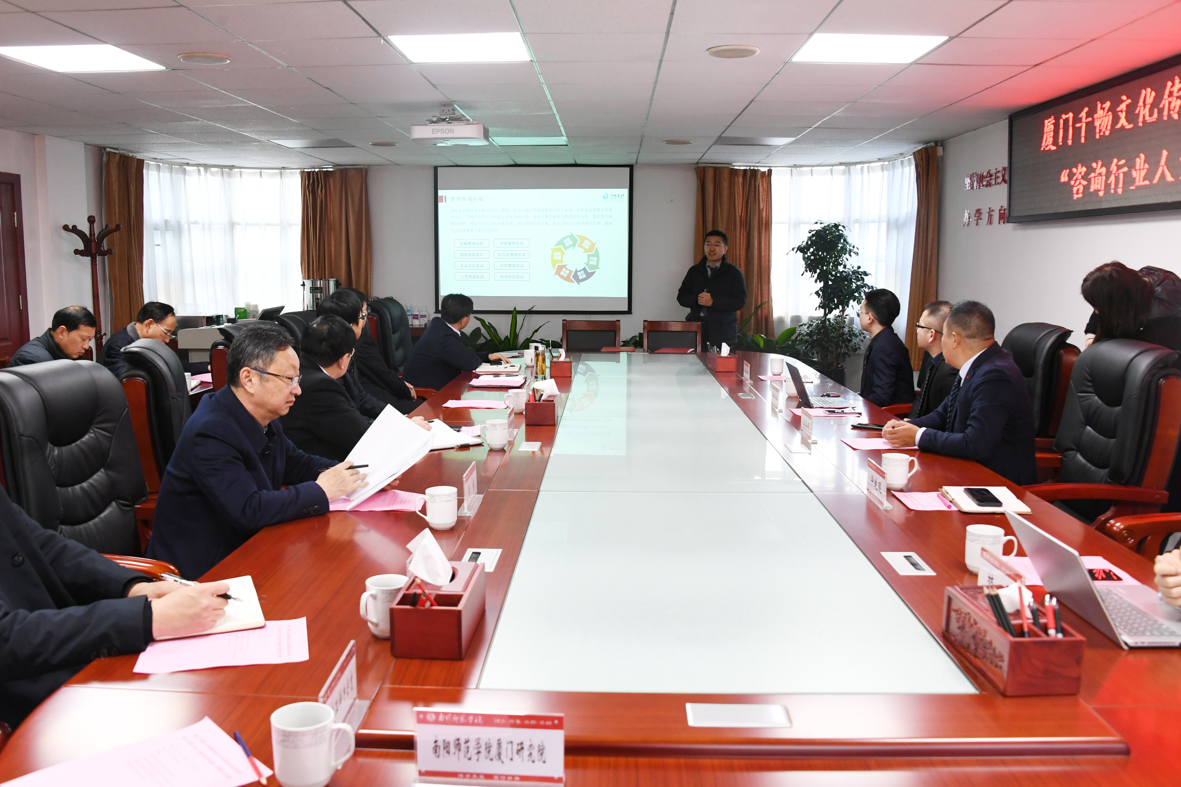 会上,张宝锋代表学校对厦门千畅文化传播有限公司李存明董事长一行来校参加“咨询行业人才联合培养基地”揭牌仪式表示热烈欢迎。他全面介绍了学校发展情况,希望双方以此次“咨询行业人才联合培养基地”成立为契机,深入开展合作。林兆裕、毕乾琨分别介绍了厦门千畅文化传播有限公司的情况及厦门千畅文化传播有限公司与必赢71886网址登录“咨询行业人才联合培养基地”筹建情况。随后,李存明表达了对必赢71886网址登录的感恩以及对必赢71886网址登录厦门研究院开放办学的支持,并对“咨询行业人才联合培养基地”的建设前景进行展望。