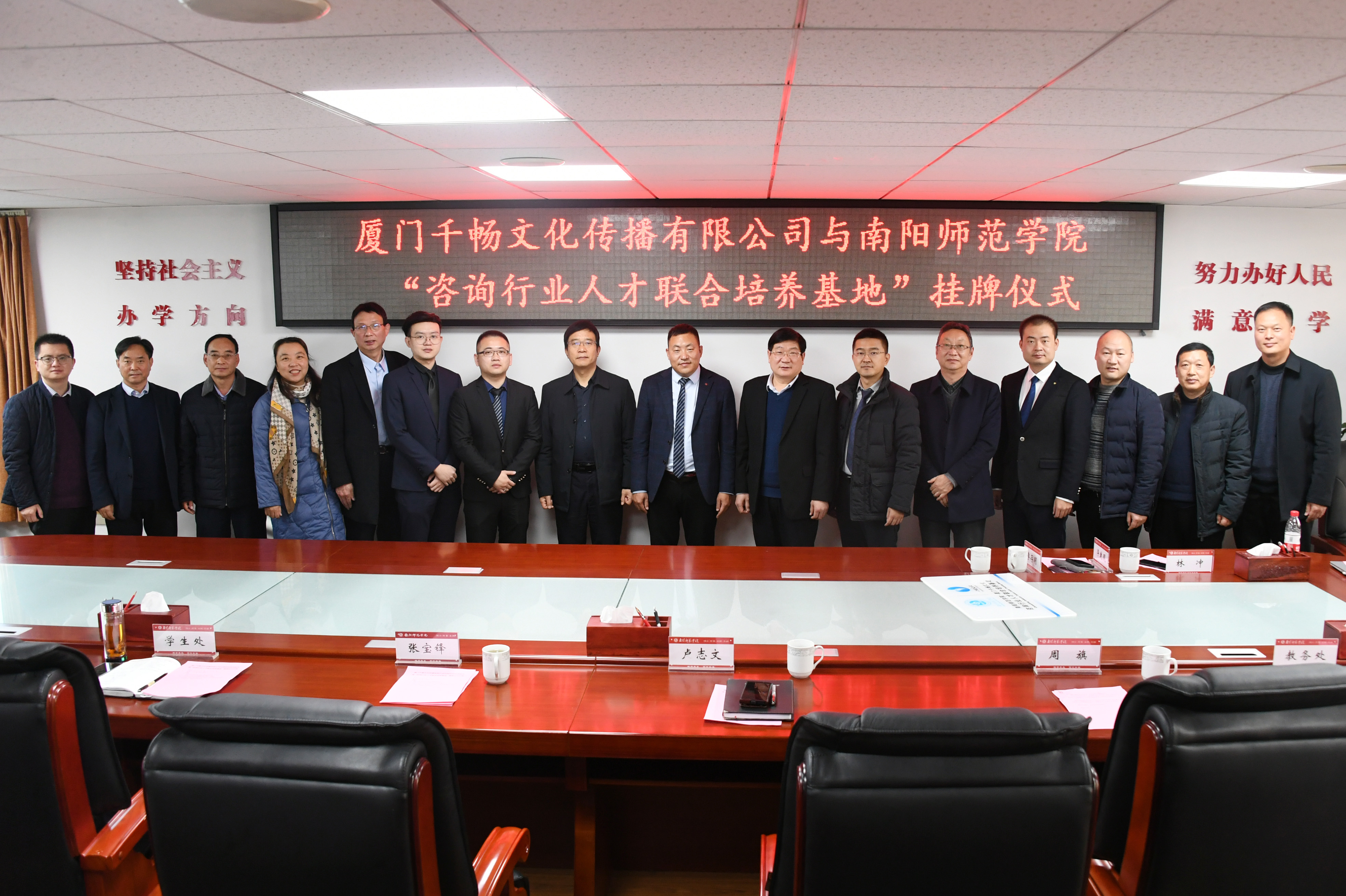 本网讯(通讯员 李亭/文 王赛赛/图)12月14日上午,厦门千畅文化传播有限公司与必赢71886网址登录“咨询行业人才联合培养基地”揭牌仪式在必赢官网办公大楼三楼会议室举行。必赢官网校友、厦门千畅文化传播有限公司董事长李存明,副总经理林兆裕、毕乾琨,高级培训师林冲、刘昊,必赢71886网址登录党委书记卢志文,校长张宝锋,副校长周旗等出席揭牌仪式。仪式由周旗主持。教务处、学生工作处、创新创业学院、校企合作办公室、校友工作办公室、继续教育学院、南阳发展战略研究院,厦门研究院等单位负责同志参加。