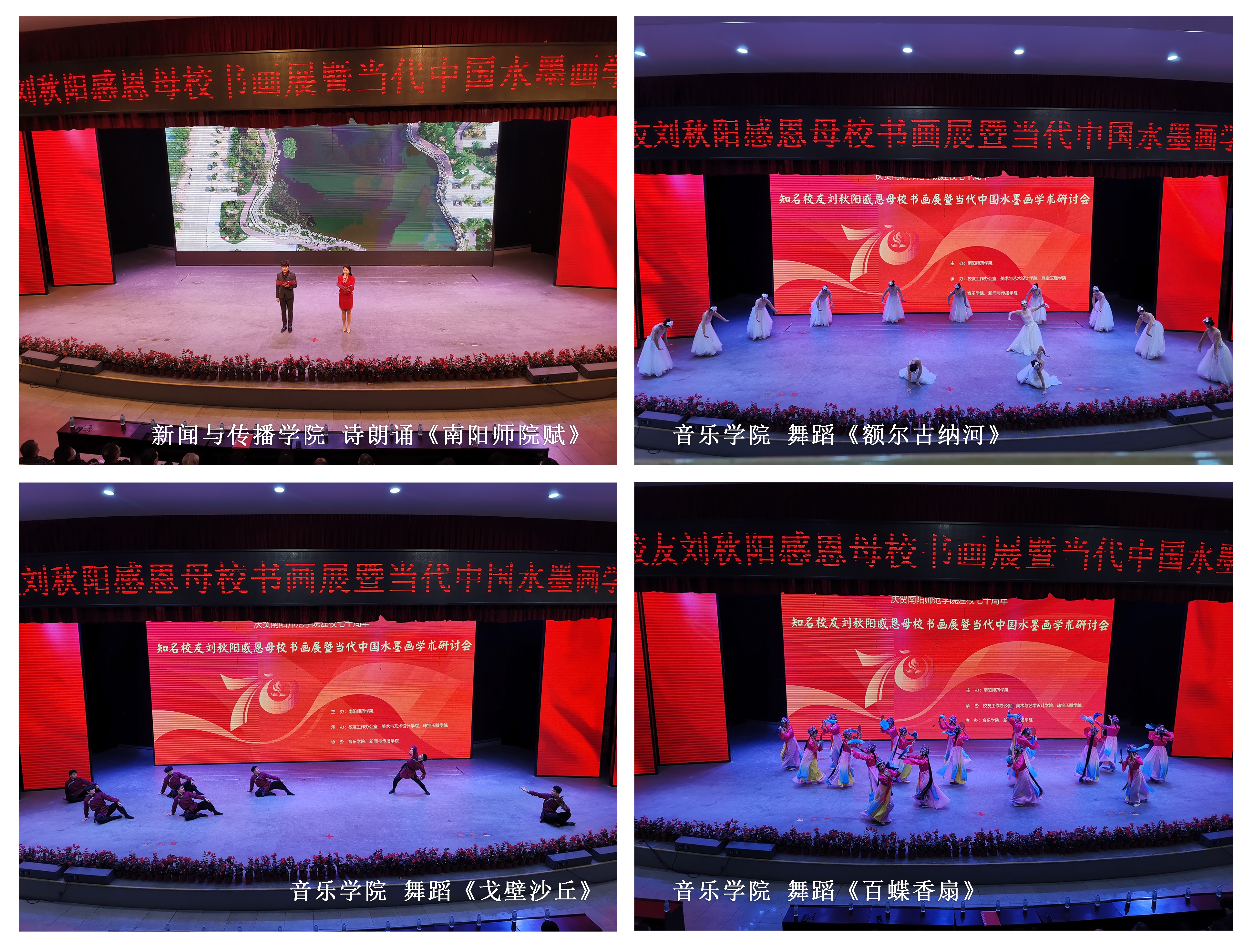 活动在新闻与传播学院的诗朗诵《南阳师院赋》中拉开帷幕,音乐学院的舞蹈作品《额尔古纳河》《戈壁沙丘》《百蝶香扇》展现了必赢官网学生扎实的专业功底,音乐学院院长马奇一曲《我和我的祖国》将现场气氛推向高潮。