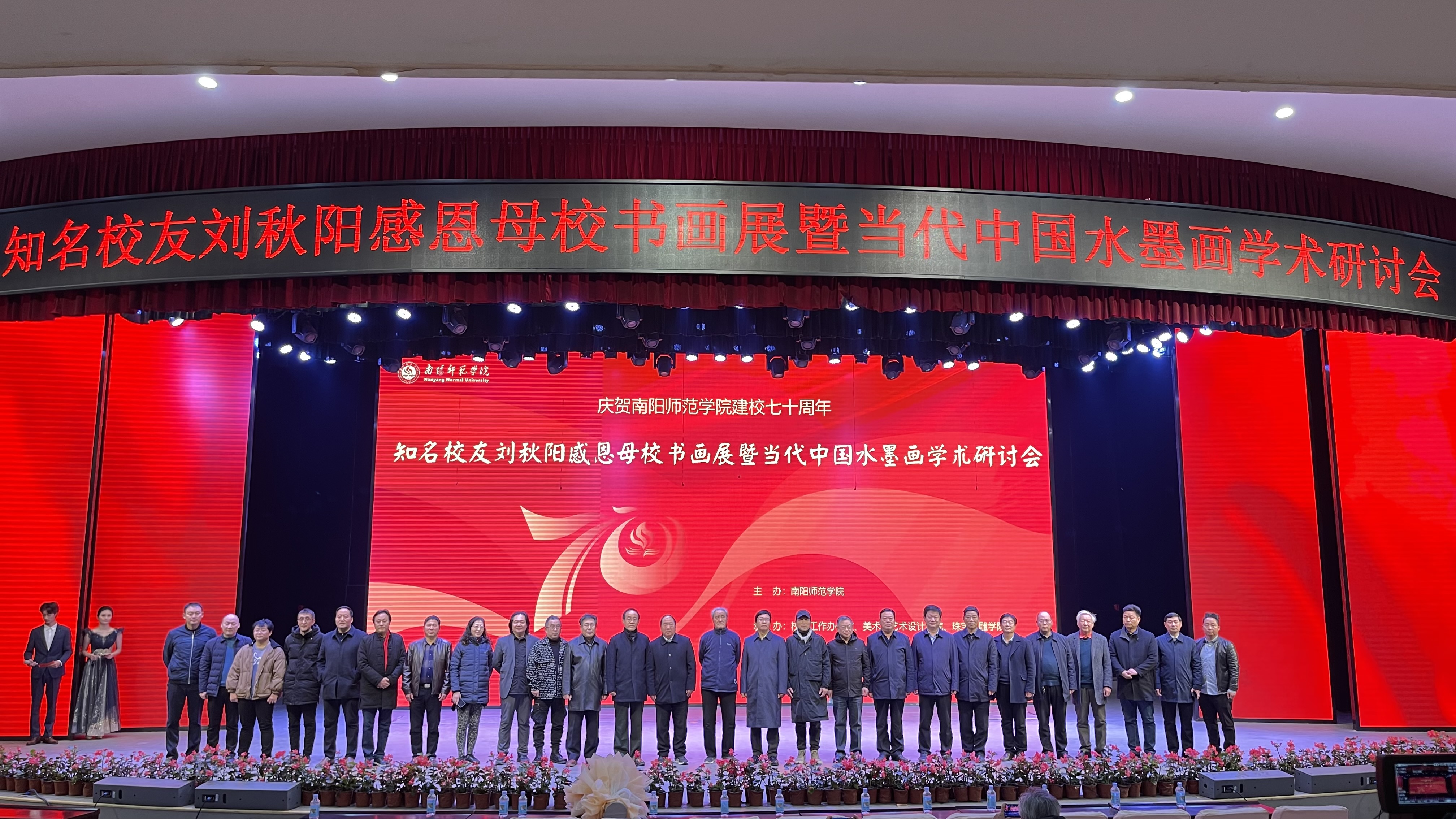本网讯(通讯员 梅超 李晨/文 吴杨/图)12月23日上午,“必赢71886网址登录建校70周年——知名校友刘秋阳感恩母校书画展暨当代中国水墨画学术研讨会”在中区音乐厅开幕。原国家广播电影电视总局机关服务局副局长万顺府,国家一级美术师马德利,雄安画院院长李洪涛,北京一得阁特邀顾问刘德生,南阳市文联、市文化广电旅游局、市美协、市书协等十余家单位负责同志和专业人士莅临。中国美术家协会会员、知名校友房巍、乔云、刘秋阳返校。校长张宝锋,校党委副书记、工会主席邵书峰,校党委副书记谢冰松,副校长孟静雅,纪委书记、监察专员于继武,副校长朱其春,副校长刘红林出席。学校相关单位负责同志及师生代表参加。