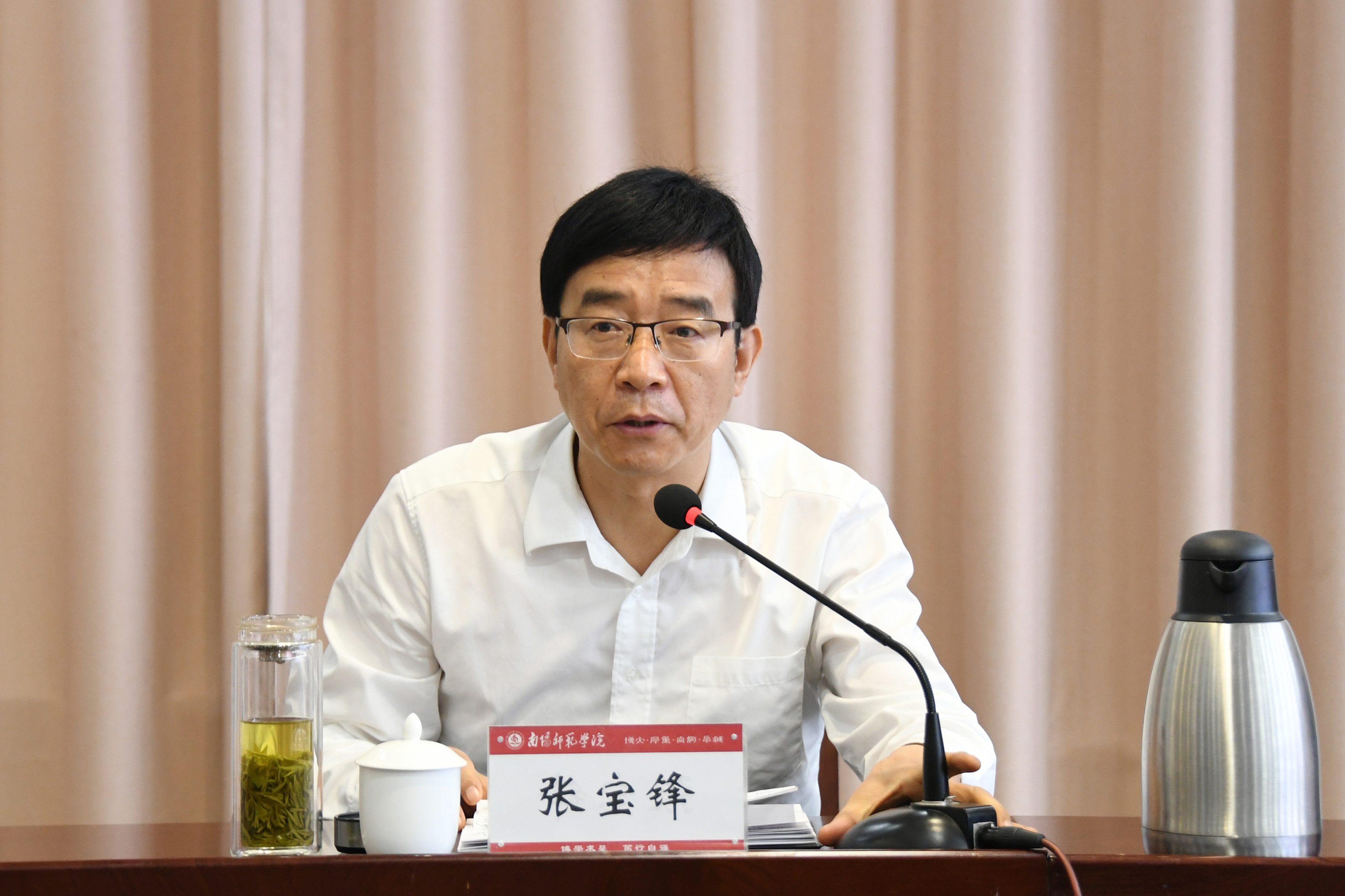 张宝锋说,中国人民大学是我们党创办的第一所新型正规大学,被誉为“我国人文社会科学高等教育领域的一面旗帜”。习近平总书记的重要讲话为我国哲学社会科学发展指明了前进方向,提供了根本遵循;教育工作者要教书育人、立德树人,青年学生要志存高远、报效祖国;学校要发挥南阳地域优势,加强哲学社会科学学科和专业建设,做出南阳师院贡献。