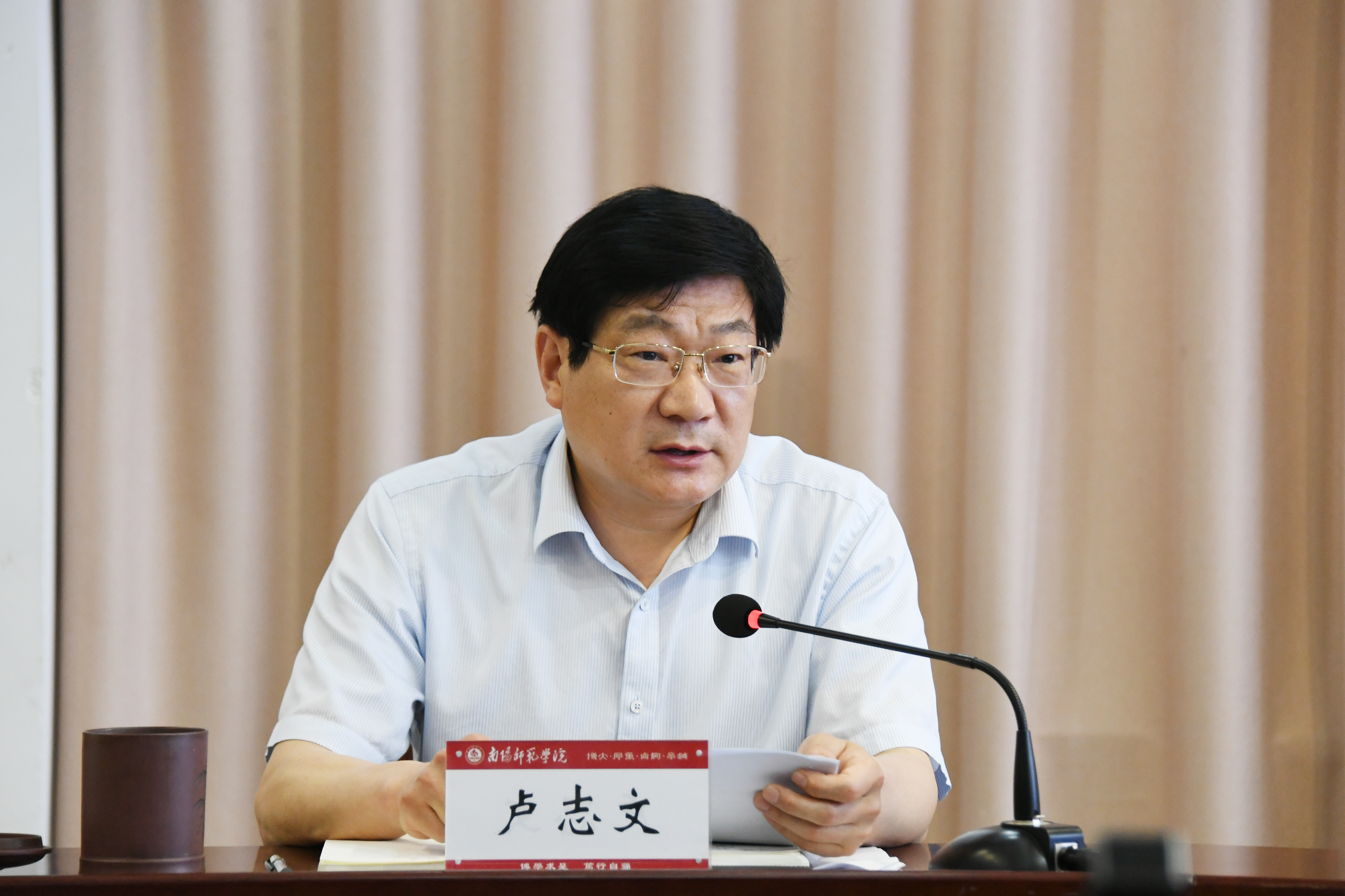卢志文就深入学习贯彻习近平总书记考察中国人民大学重要讲话精神,提出明确要求。一是坚持扎根中国大地办大学,让党放心、不负人民;二是要传承红色基因,赓续红色血脉;三是要全面推进课程思政建设,增强大学生的志气、骨气、底气;四是要加强教师队伍建设,着力培养新时代的“大先生”;五是要跑出青年好成绩,争做时代新人,肩负民族复兴重任,为我国早日成为科技强国、经济强国,为实现中华民族伟大复兴中国梦,贡献南阳师院师生的智慧和力量!
