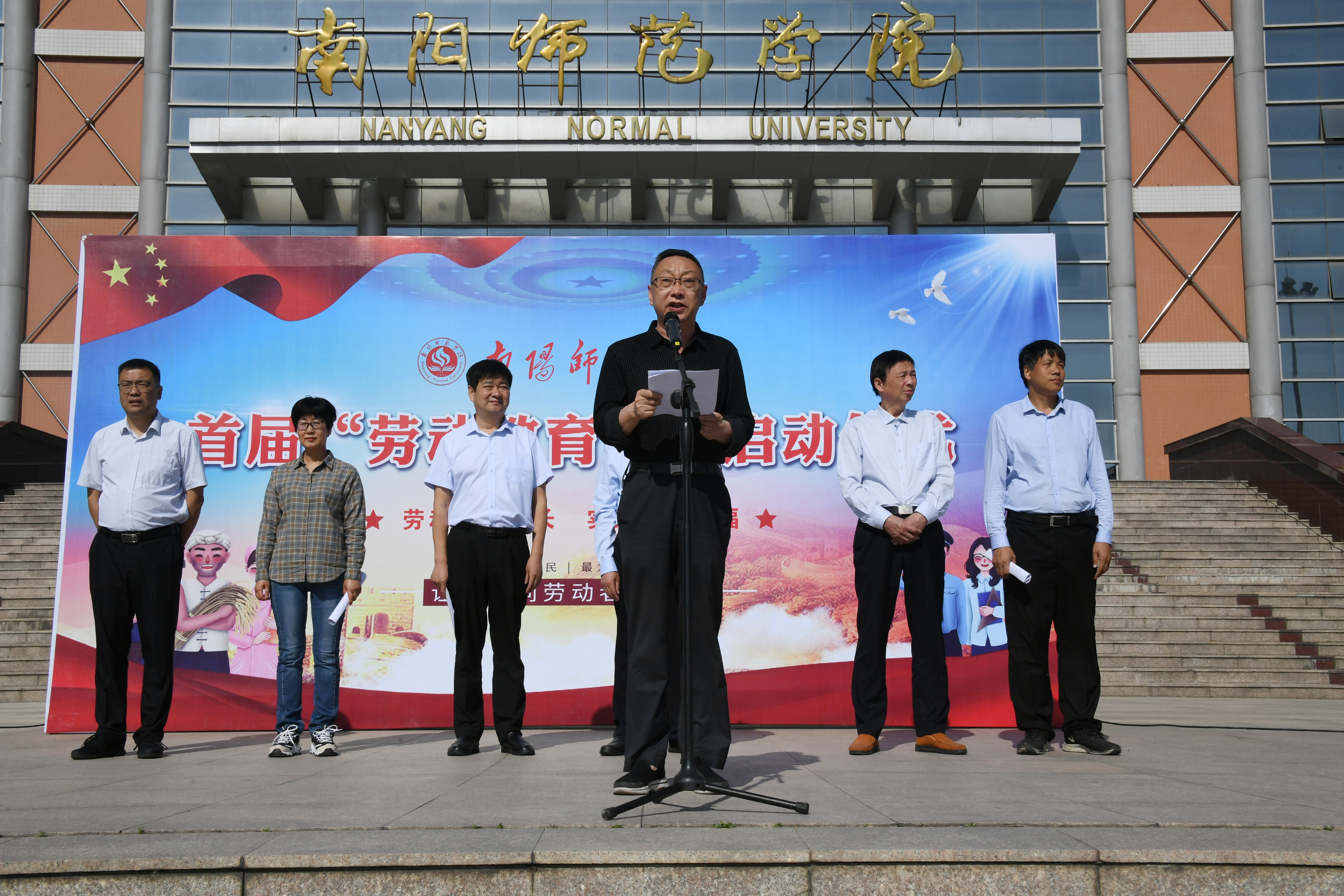 本网讯(陈欣/文 王占元 刘奥男/图)5月5日上午,必赢71886网址登录首届劳动教育周启动仪式在逸夫教学楼东广场举行。校党委副书记谢冰松、副校长周旗出席,相关职能部门负责同志与各学院教师代表、劳动周学生代表参加。仪式由周旗主持。