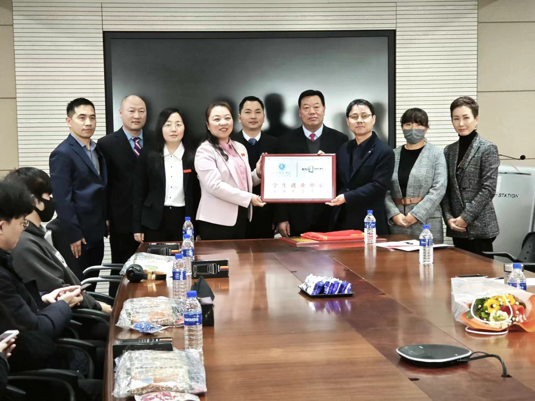 创新创业学院院长、就业指导中心主任杨洋向京畿大学国际交流中心负责人夏邦恩颁授学生就业中心匾牌。