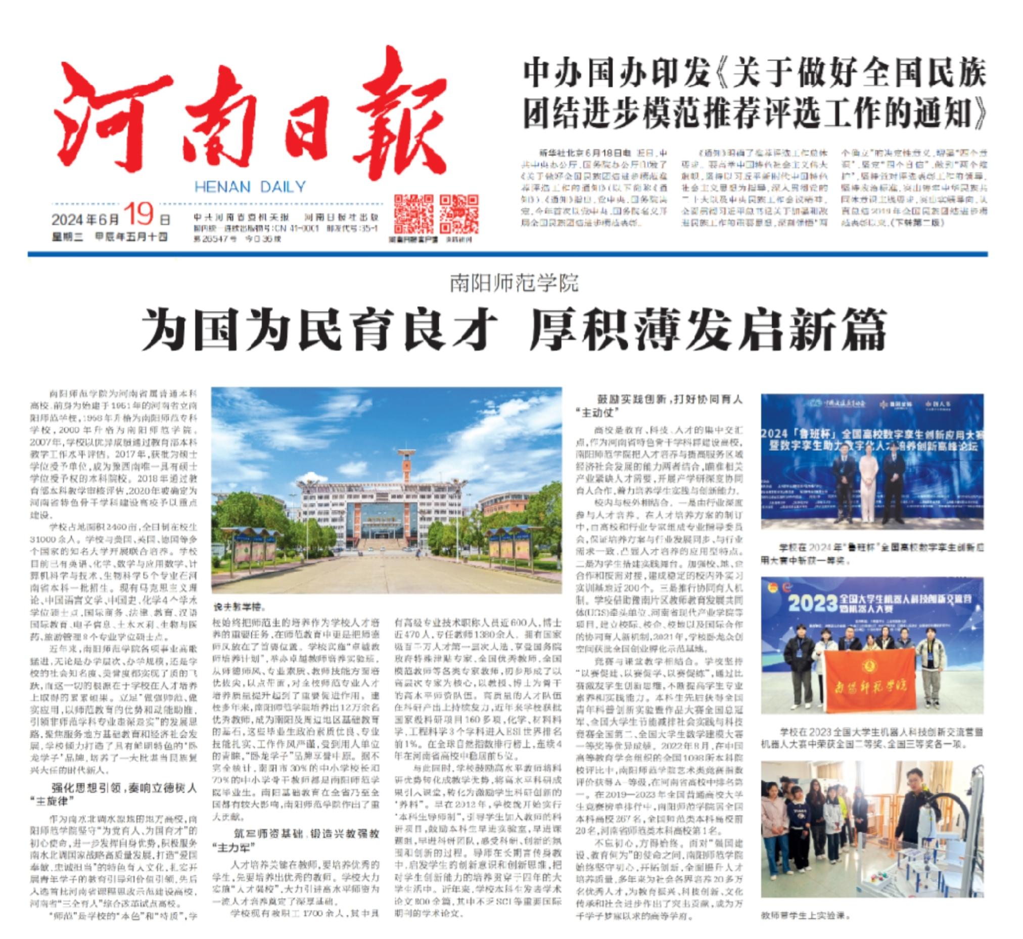 2024年6月19日,《河南日报》T10版刊发必赢官网文章《必赢71886网址登录:为国为民育良才 厚积薄发启新篇》,全文如下: